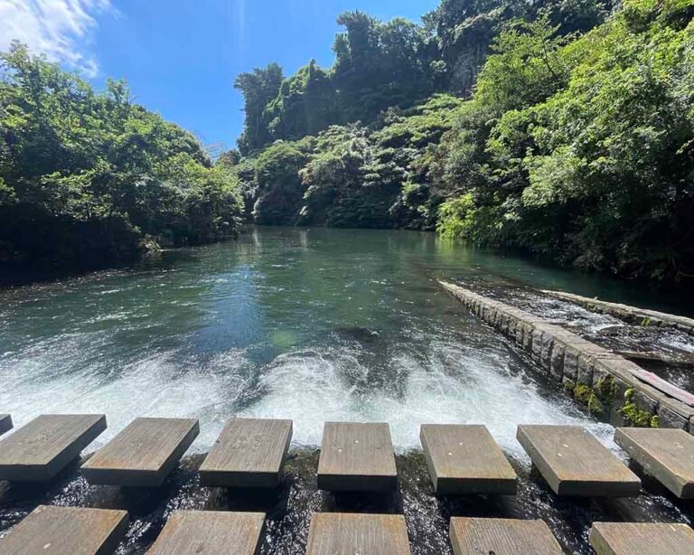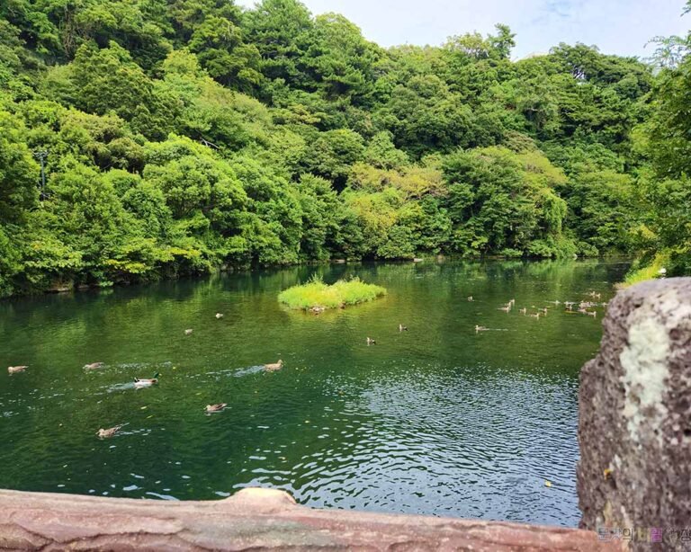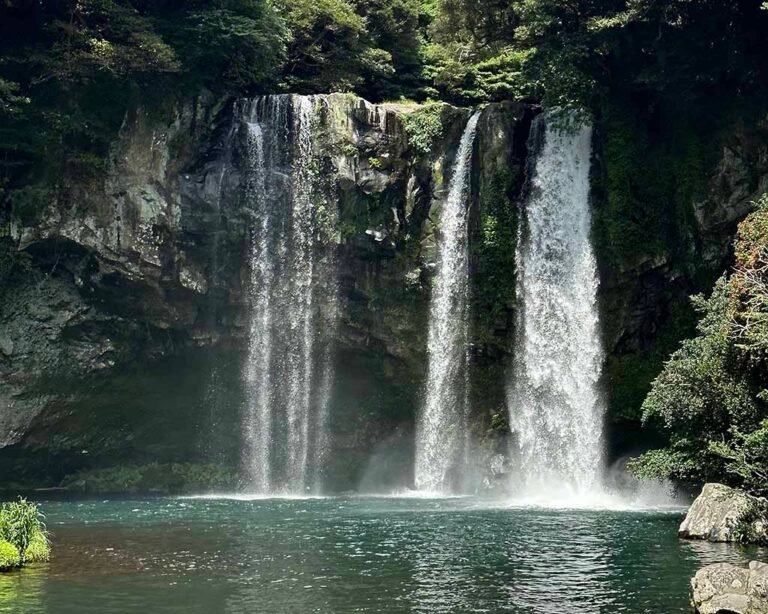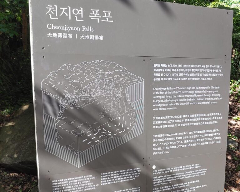 天地渊瀑布位于韩国西归浦市西烘洞。相传高22公尺宽约12公尺的天地渊瀑布得名乃因天与地希望能相连,固以此巨大水瀑做为连结点,串起天上地下的关联。湖水里面栖息着被指定为天然纪念物258号的巨鳗,周围溪古里生长着天然纪念物胆八树。天地渊溪谷深处,洋溢着为温带林围绕的热带风情。