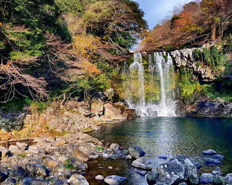 因为传说中玉皇大帝身边的七仙女偷下凡间沐浴嬉戏而得名的天帝渊瀑布被郁郁葱葱的山岭分割成第1、2、3瀑布,尤其以与其它两段瀑布相隔较远的第3段瀑布从仙林桥上望去最为美丽。天池渊溪谷里雕有七仙女美丽塑像的雅致的“仙林桥”和名为“天帝楼”的楼阁,给周围的景致更添魅力。