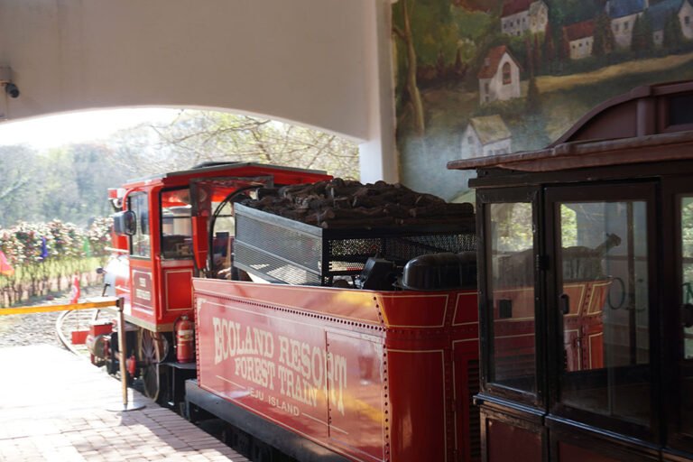 森林小火车EcoLand共有五部小火车,并分别漆上济州岛最具代表性的五种生态色彩。红色代表火山,黑色为玄武岩,黄色是油菜花,绿色象征绿草地,蓝色则为蓝天。生态公园则由小火车将四个主题园区串联起来,整个公园分为五站,分别是总站、生态走廊地区、湖边站、郊游花园站以及薰衣草、绿茶与玫瑰花园站。