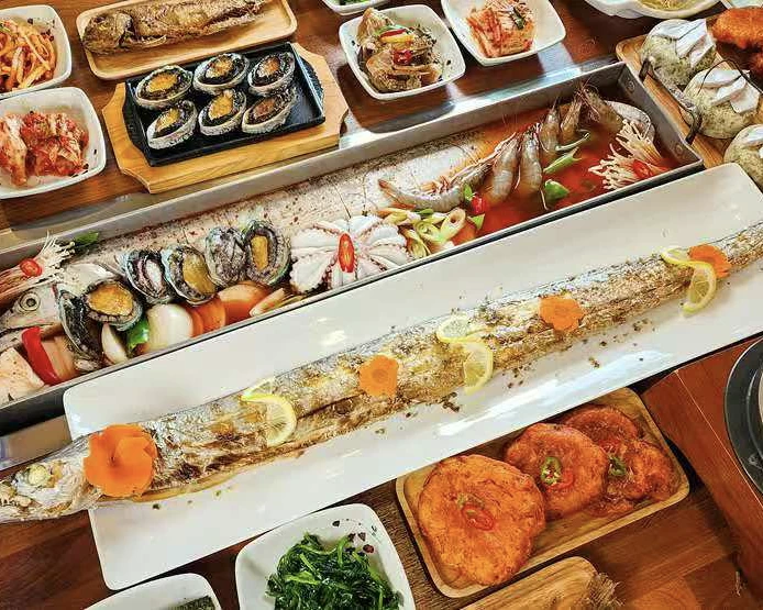 济州岛烤炖带鱼(갈치구이/갈치조림)是济州岛的特色美食,以新鲜带鱼为主要食材,通过烤制或炖煮的方式烹饪,口味鲜美。烤带鱼将带鱼直接烤制,保留鱼肉的原味;炖带鱼则用酱料炖煮,味道更浓郁入味。