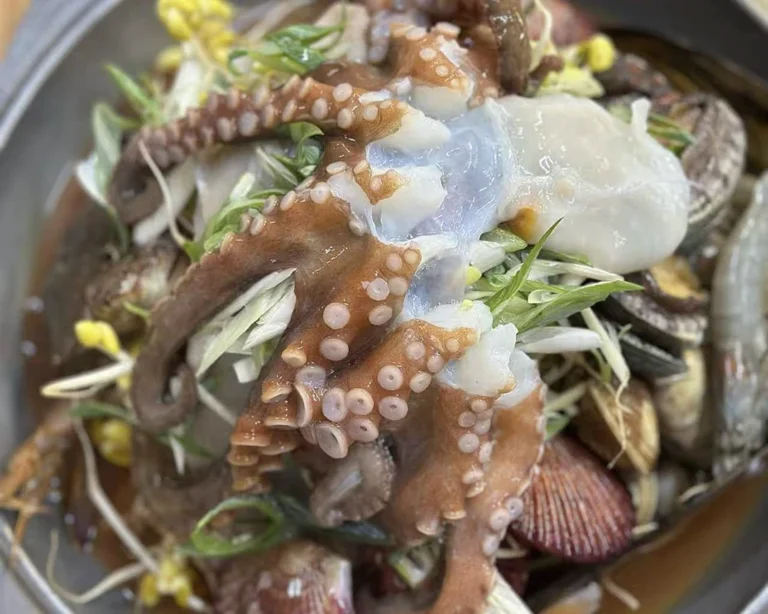 济州岛海鲜锅以其新鲜、丰富的海鲜和原汁原味的鲜甜汤底而闻名,通常会加入鲍鱼、章鱼、大虾、蟹和各种贝类,有时甚至有活章鱼在锅中蠕动。烹饪时不会使用过多调味品,而是突出海鲜的天然味道。最后还可以加入面条,煮成海鲜拉面,吸取汤底的精华