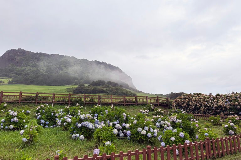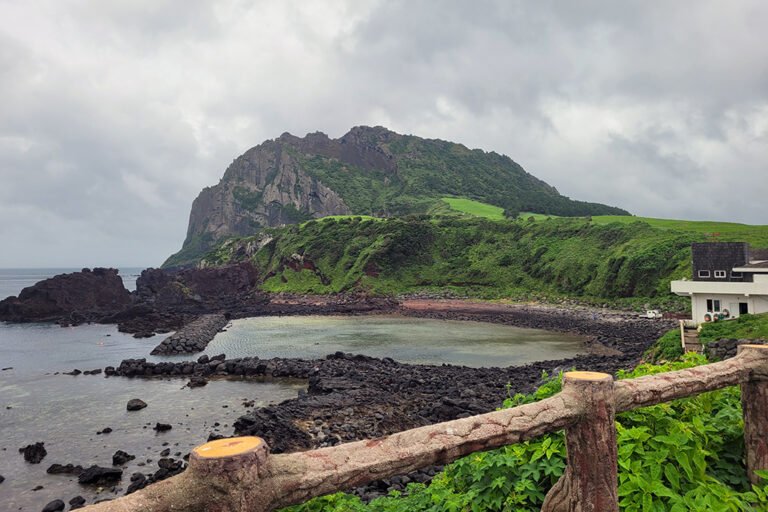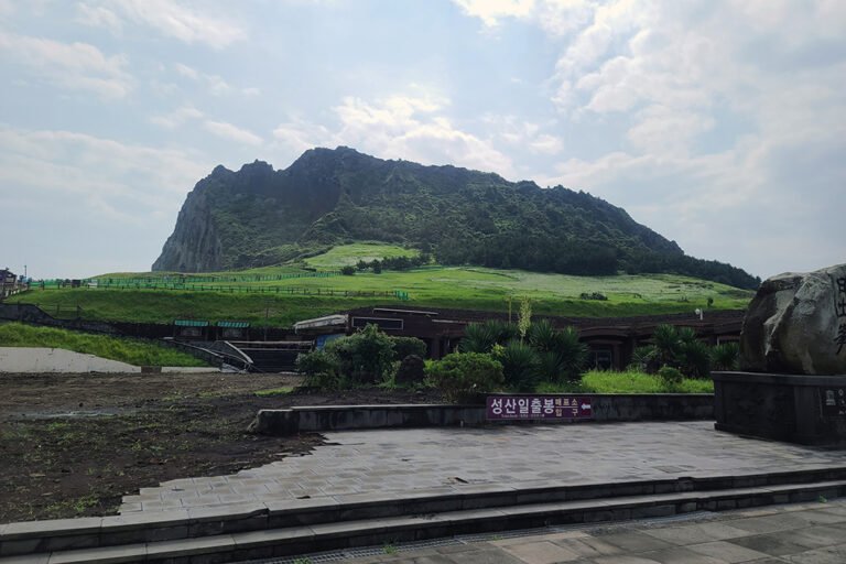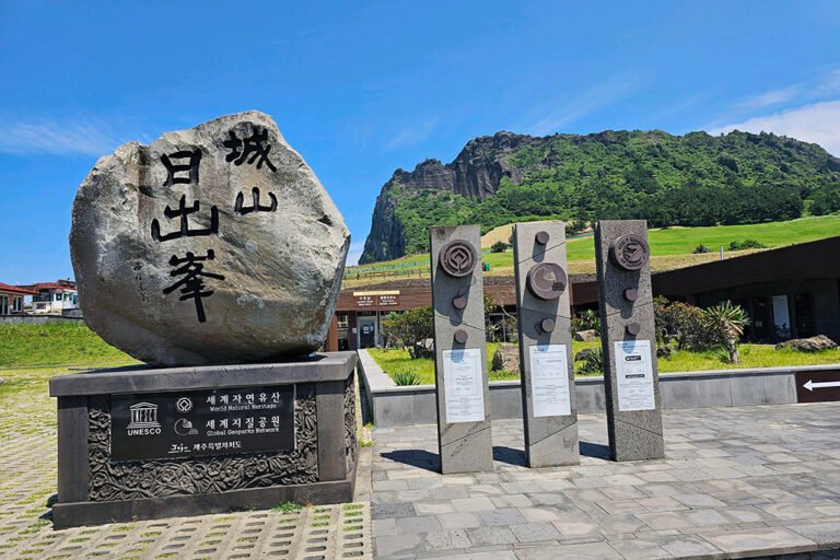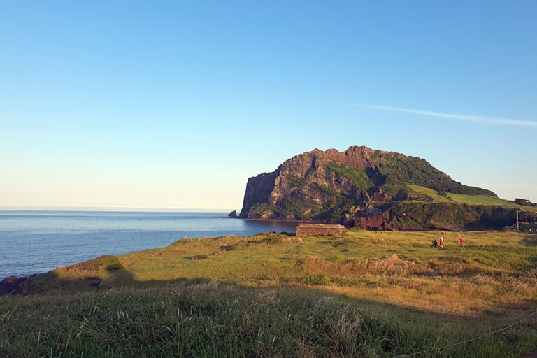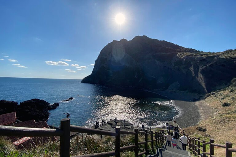 位于济州岛东端的城山日出峰是10万年前济州岛众多的火山口中较为罕见的一个从海中喷发出的火山体。这里原来是一个孤立的火山岛,由于新阳海水浴场的砂砾逐渐堆积,使得小岛与陆地连在一起。日出峰海拔182米,山顶上有一个直径为600米、深90米的沙钵形火山口。99块尖石围绕在火山口周围,如同一顶巨大的皇冠。