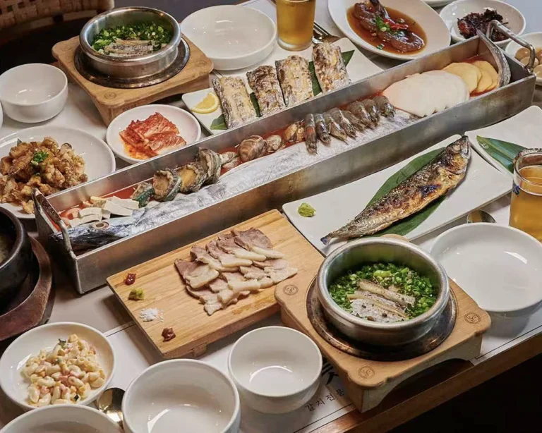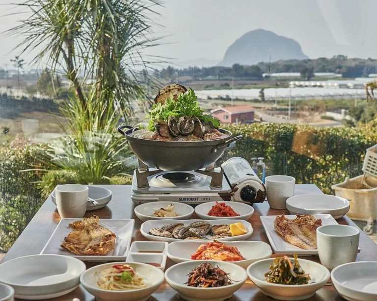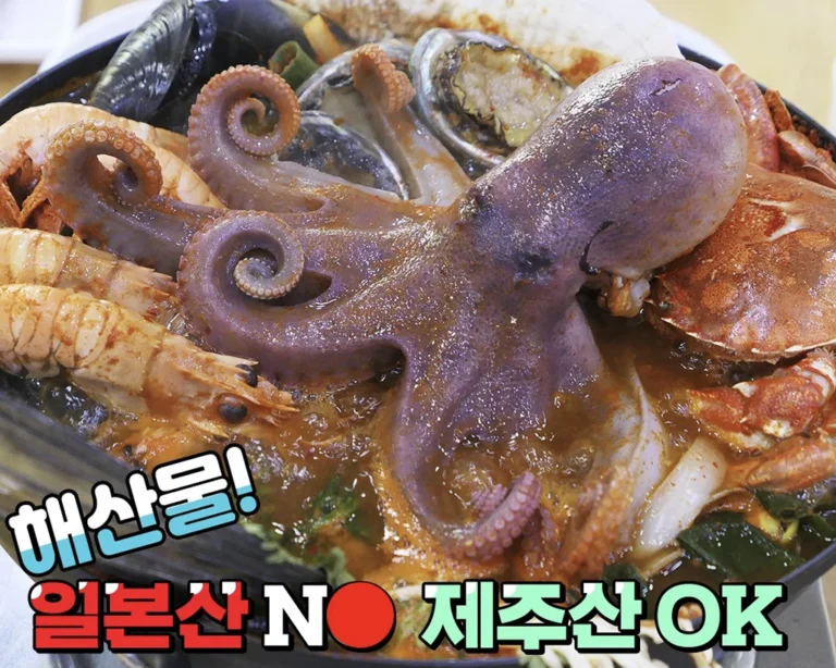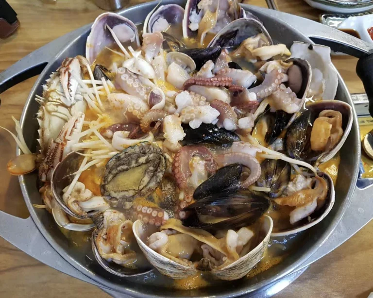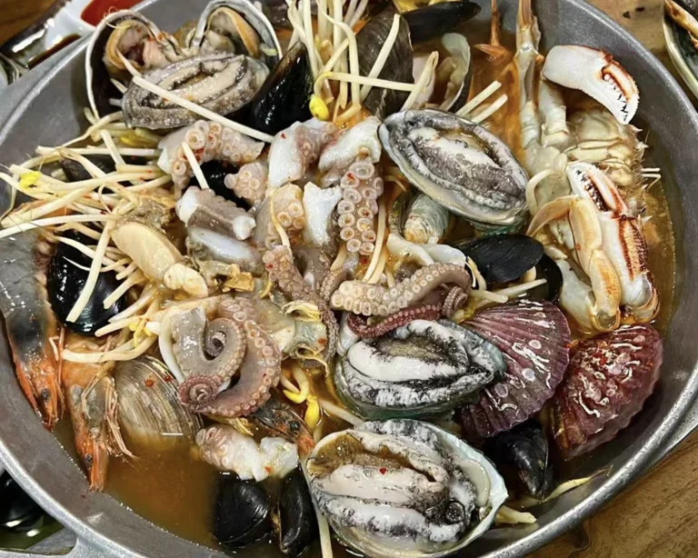 济州岛海鲜锅以其新鲜、丰富的海鲜和原汁原味的鲜甜汤底而闻名,通常会加入鲍鱼、章鱼、大虾、蟹和各种贝类,有时甚至有活章鱼在锅中蠕动。烹饪时不会使用过多调味品,而是突出海鲜的天然味道。最后还可以加入面条,煮成海鲜拉面,吸取汤底的精华