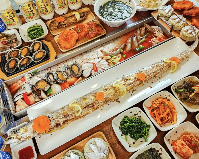 济州岛烤炖带鱼(갈치구이/갈치조림)是济州岛的特色美食,以新鲜带鱼为主要食材,通过烤制或炖煮的方式烹饪,口味鲜美。烤带鱼将带鱼直接烤制,保留鱼肉的原味;炖带鱼则用酱料炖煮,味道更浓郁入味。